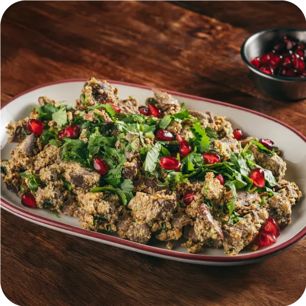 | To prepare the Pkhali, spinach is boiled in hot water, drained, and then mixed with walnuts, garlic, fresh coriander, dried spices, and vinegar. The mixture is shaped and decorated with pomegranate seeds before serving. It pairs wonderfully with Mchadi, which is why you can enjoy it with Mchadi chips at Tsiskvili. | |