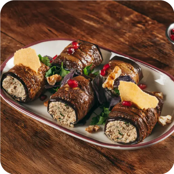 | Like khachapuri, you will often find eggplant with walnuts on Georgian festive tables, as it is one of the outstanding dishes of Georgian vegetarian cuisine. It has two main ingredients – eggplant and walnuts, which are mixed with spices, fresh coriander, garlic, salt, and vinegar. The mixture is placed on fried eggplant slices and rolled into rings. | ![]() |